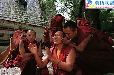 虔诚的辩论 在拥有六百年历史的色拉寺的一个午后,年轻的喇嘛们正聚在一起辩论藏传佛教的基本教义。