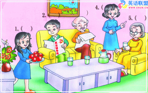 瞧这一家,他们在说什么呢?请小朋友们仔细阅读下列句子,聪明的你们一定会“对号入座”的。 A. These apples are very fresh. B. Thank you. C. Here’s a glass of water. D. Oh, good news here. E. English Coaching Paper is very interesting. Key:1.A 2.E 3.D 4.C 5.B |